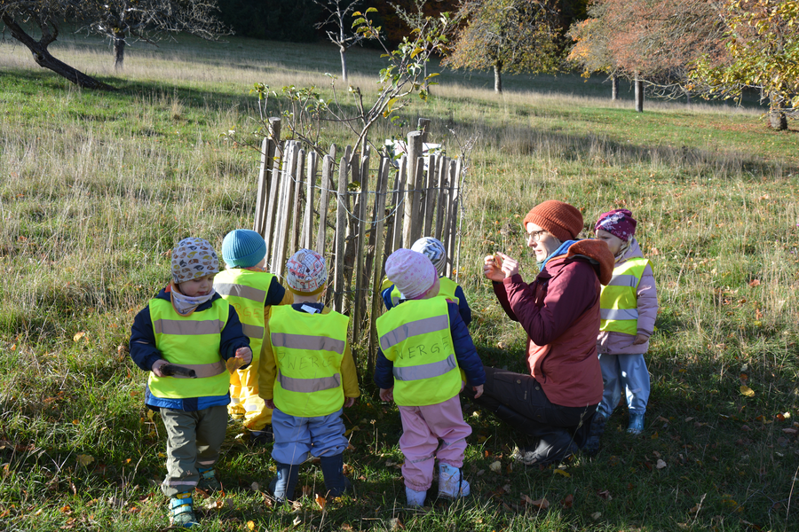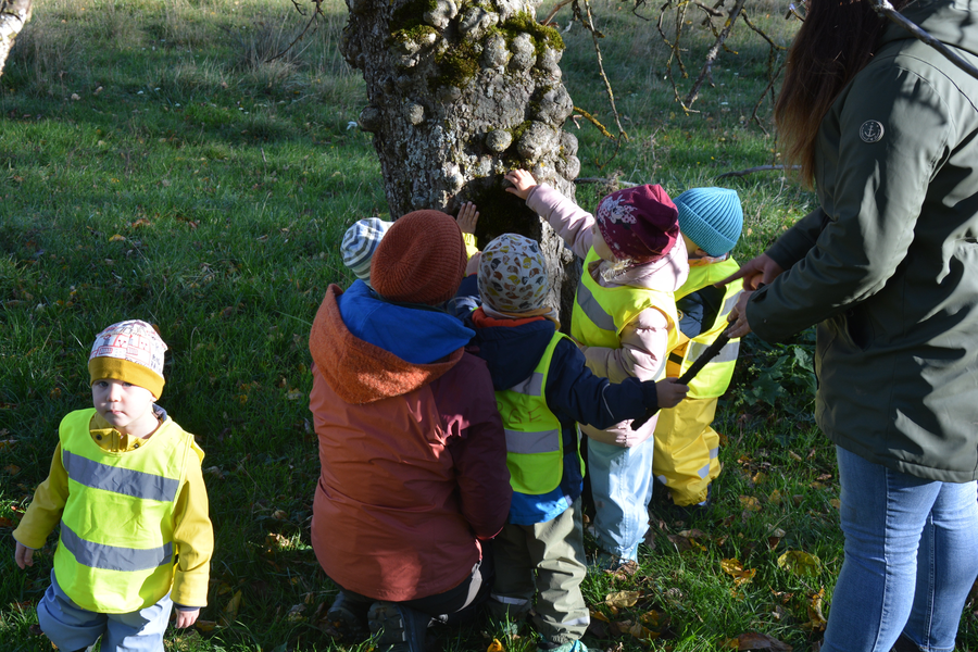 Auf Bildern schauten sich die Kinder erst typische Apfelbaum-Blätter und -Rinden an, bevor sie auf der Buchleite umherstreiften und sich die dortigen Apfelbäume genauer anschauten. Die raue Rinde wurde befühlt und es gab sogar noch den ein oder anderen einzelnen Apfel, der geerntet und natürlich auch gleich probiert werden konnte! Der Besuch beim kleinen Apfelbaum, der vor einigen Jahren vom Kindergarten gepflanzt wurde, war selbstverständlich auch Pflicht.