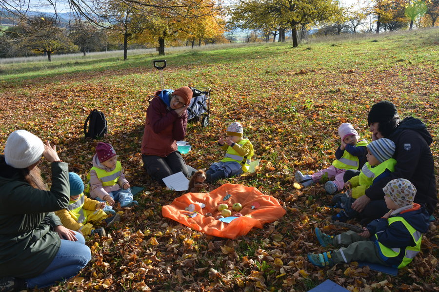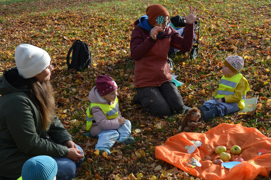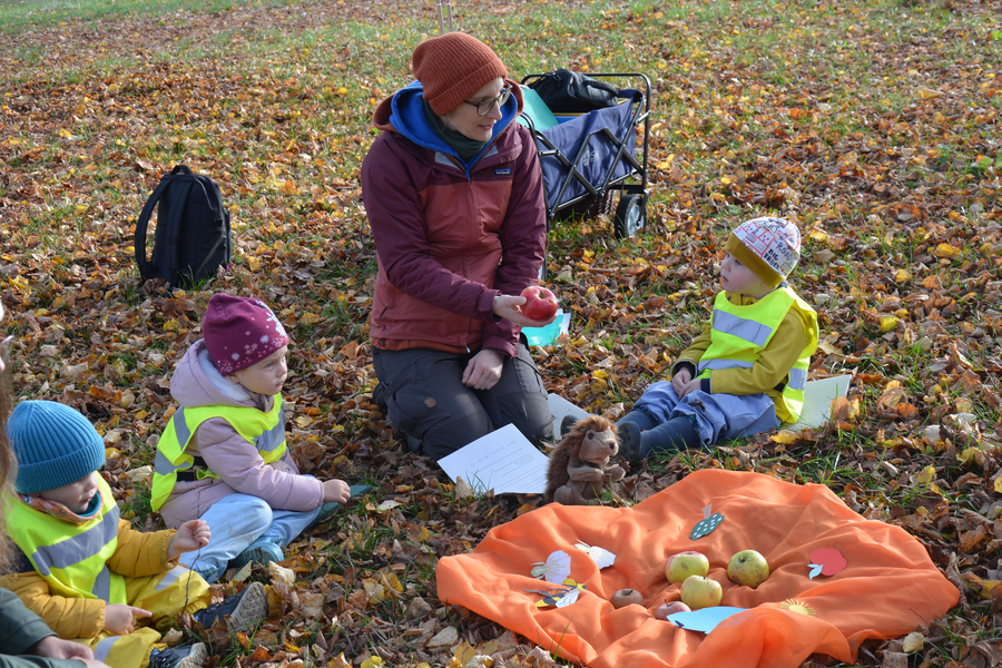 Am Mittwoch, den 29. Oktober 2025 von 9 bis 10 Uhr, kamen die größeren Kinder der Krippengruppe aus der Kita Villa Kunterbunt in Markt Berolzheim den steilen Weg zur Buchleite hochgewandert und wurden dafür direkt mit einem goldenen Oktober-Sonnenschein unter den Sieben Linden belohnt. Das LBV-Team begrüßte die Kinder zusammen mit Igel Mecki, der sich von allen Kindern nach einer so langen Zeit erst einmal durchknuddeln ließ. Dann zeigte er den Kindern einige verschiedene Äpfel, die das LBV-Team von der Streuobstwiese aus Muhr am See mitgebracht hatte und mit verschiedenen gebastelten Figuren wurde die Entstehung im Jahresverlauf von der Blüte zum Apfel nachgespielt.