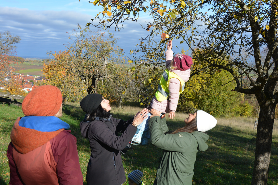Auf Bildern schauten sich die Kinder erst typische Apfelbaum-Blätter und -Rinden an, bevor sie auf der Buchleite umherstreiften und sich die dortigen Apfelbäume genauer anschauten. Die raue Rinde wurde befühlt und es gab sogar noch den ein oder anderen einzelnen Apfel, der geerntet und natürlich auch gleich probiert werden konnte! Der Besuch beim kleinen Apfelbaum, der vor einigen Jahren vom Kindergarten gepflanzt wurde, war selbstverständlich auch Pflicht.