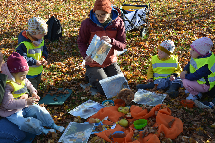 Nach einem Mitmach-Apfellied durften sich die Kinder die mitgebrachten Äpfel genauer anschauen und stellten fest, dass alle ganz unterschiedlich groß waren und verschiedenste Schalen-Farben und -Strukturen hatten. Das Probieren der verschiedenen Apfelsorten war ein Highlight an diesem sonnigen Herbst-Vormittag. Die Kinder griffen begeistert zu und alle fanden eine oder meist mehrere Sorten, die ihnen am besten schmeckten – ob süß, sauer oder eher würzig, saftig oder mehlig.
